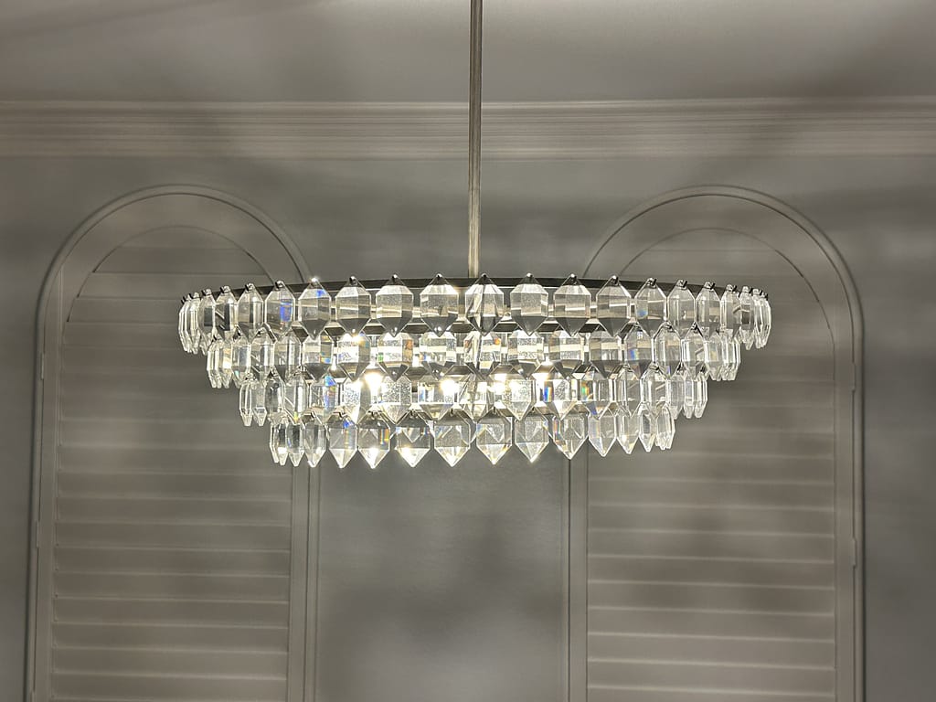 The two table chandeliers were chosen to outfit formal and informal eating areas. The formal eating area is located near the foyer, therefore those chandeliers coordinate. We chose a “modern crystal” look for those areas.